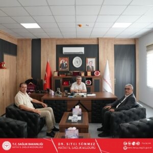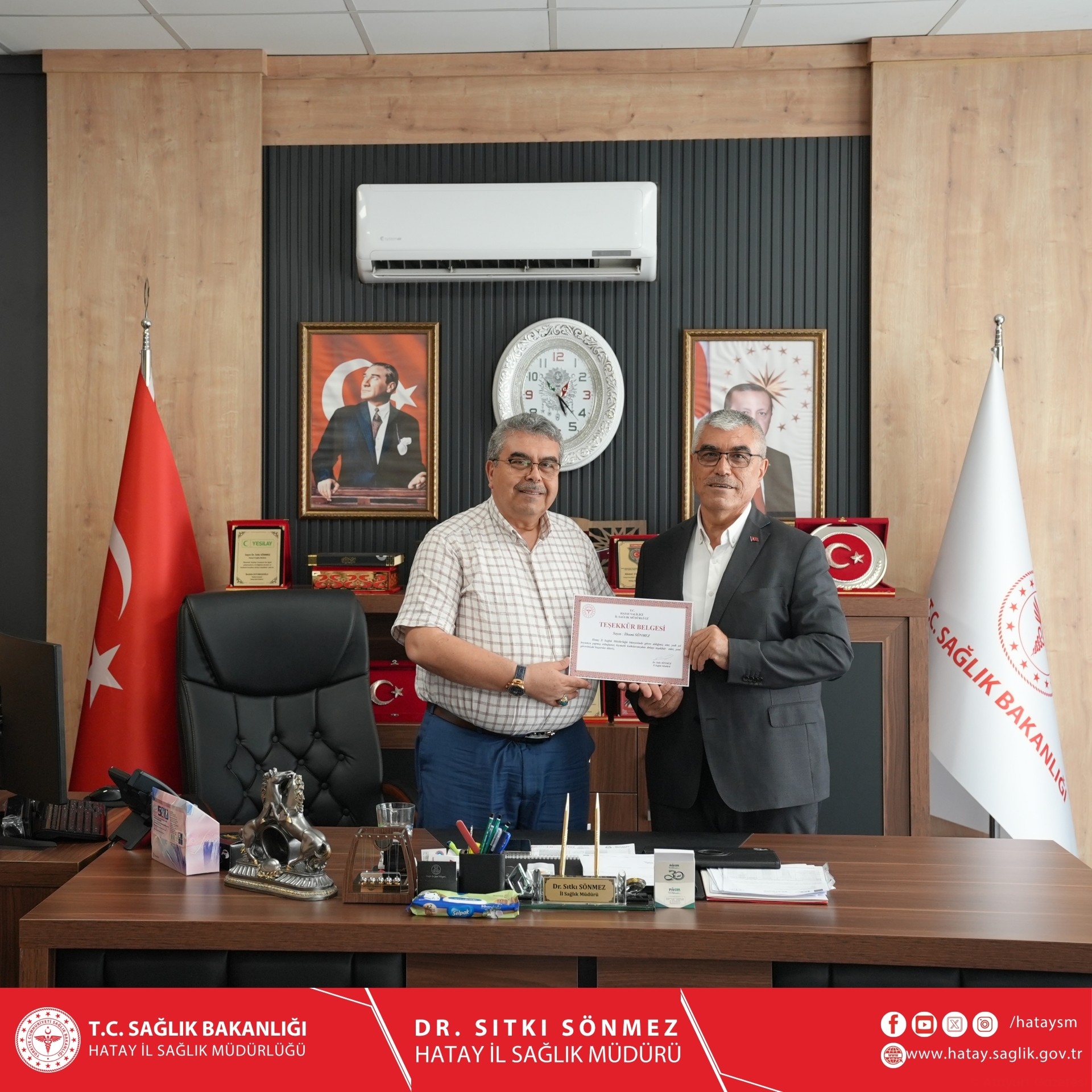 “İl Sağlık Müdürümüz Dr. Sıtkı Sönmez, Hatay İl Sağlık Müdürlüğü’nde Halk Sağlığı Başkan Yardımcısı olarak görev yaparken, Hatay Büyükşehir Belediyesi Muhtarlıklar Daire Başkanı olarak atanan İlhami Sönmez’e kurumumuza sunduğu katkı ve hizmetlerinden dolayı teşekkür belgesi takdim etti.