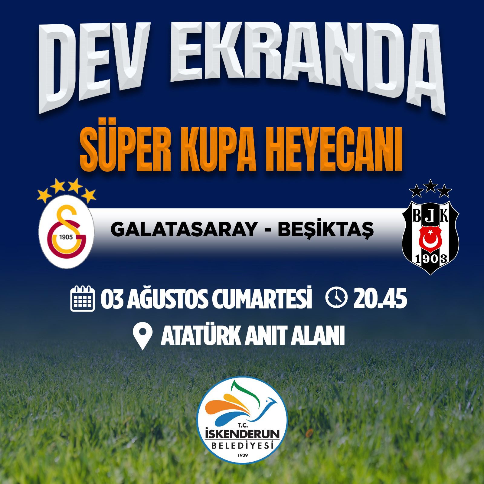 Atatürk Anıt Alanında 3 Ağustos Cumartesi günü (yarın) saat 20.45’de Türkiye Süper Kupa mücadelesinde karşılaşacak Galatasaray-Beşiktaş maçını dev ekranda izliyoruz. Çeşitli ikramlar ve dev ekranda maç heyecanı için tüm halkımız davetlidir.