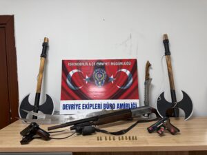 Hatay Valiliğinden yapılan açıklamada, Hatay Emniyet Müdürlüğü görevlilerince 17.04.2026 tarihinde İskenderun Yunus Emre Mahallesi’nde bir ikametin balkon kısmında, gözle görülür vaziyette; 1 adet tüfek, 2 adet tabanca, balta ve kılıç asılı olduğu görüldüğü, şüpheli B.A. yakalanarak gerekli işlemler yapıldığı bildirildi.