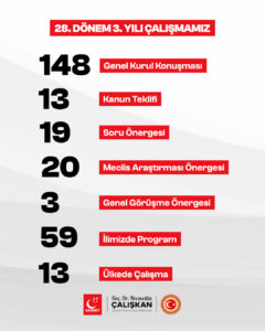 Hatay Milletvekili Necmettin Çalışkan’ın sadece 3. yasama yılında yaptığı 148 Genel Kurul konuşması, 13 kanun teklifi, 19 soru önergesi, 20 araştırma önergesi, 3 genel görüşme önergesi, 59 il programı ve 13 farklı ülkede saha çalışması bulunuyor.
