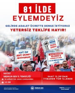 Memur Sen Hatay Şubesi , 81 İl’de eş zamanlı olarak saat 12.15’te eylemlerini gerçekleştireceklerini açıklamasında yer verdi.