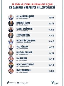 8 bin 200 katılımcı ile 8–14 Ağustos tarihleri arasında yapılan ankette, TBMM’de en etkin muhalefet milletvekilleri soruldu. İlk 10’a giren isimlerin 8’i CHP’den, 1’i İYİ Parti’den, 1’i ise Saadet Partisi’nden oldu.