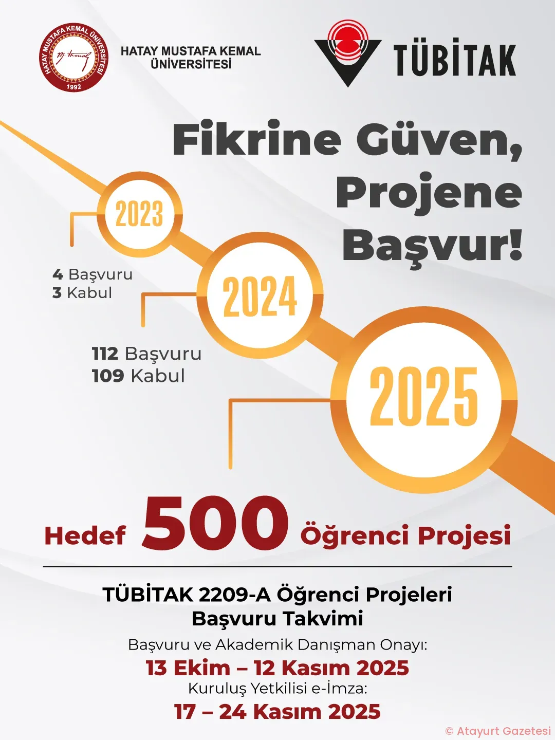 2024 döneminde yapılan 212 proje başvurusundan 109’unun desteklenmeye hak kazanması, Mustafa Kemal Üniversitesi’ni Türkiye genelinde 179’uncu sıradan 56’ncı sıraya taşıdı. Üniversite yönetimi, 2025 döneminde bu ivmeyi artırarak 500 proje başvurusuna ulaşmayı hedefliyor.
