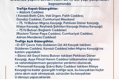 Hatay Büyükşehir Belediyesi, 23-27 Aralık tarihleri arasında Antakya’da asfealt çalışmalarından dolayı trafiğe kapatılacak caddelere ilişkin sürücülerin, resmi kurumların trafik işaret ve işaretçileri...