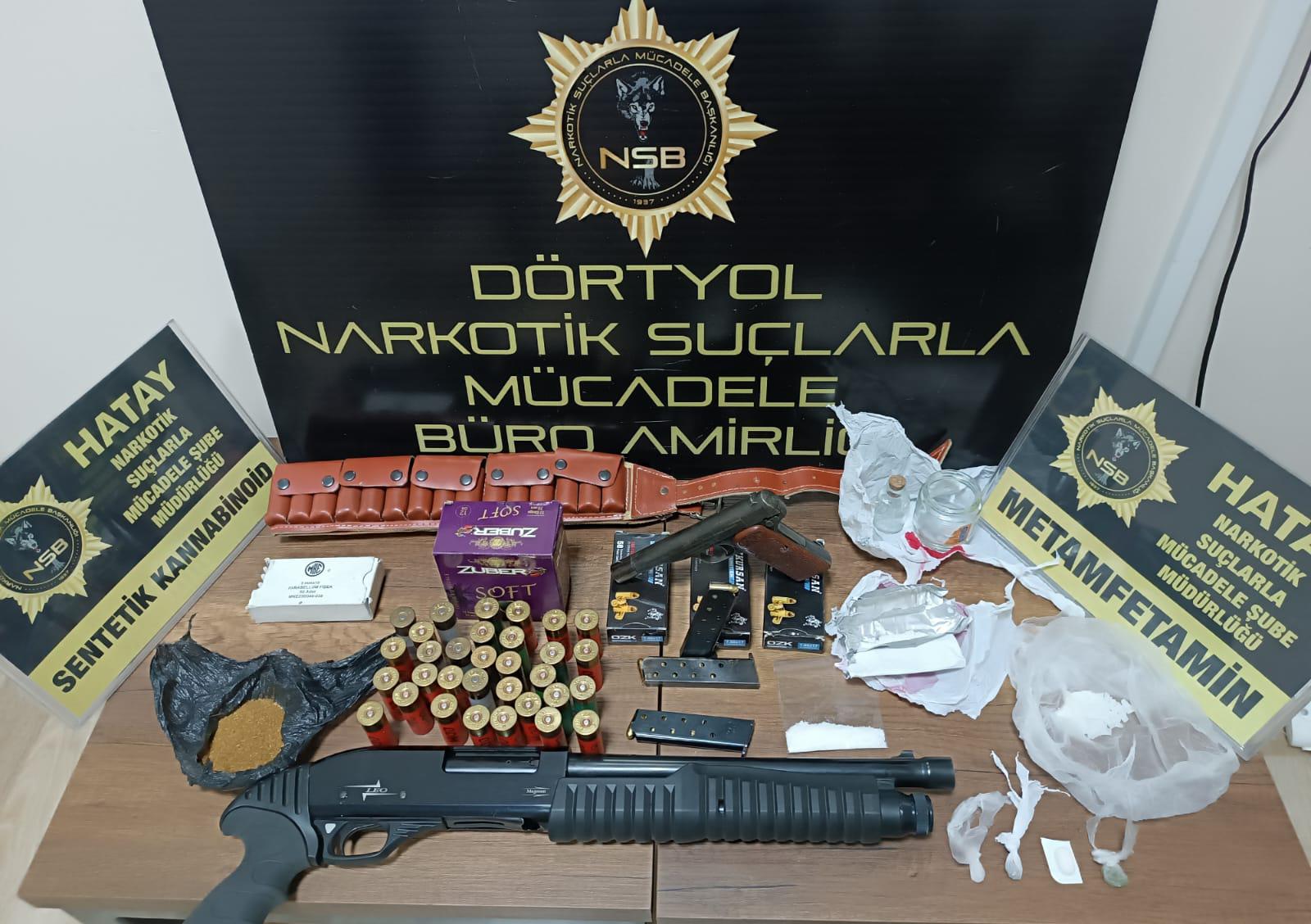 Hatay’ın Dörtyol ilçesinde bir evde yapılan aramada, çok sayıda uyuşturucunun yanı sıra, ruhsatsız tüfek ve tabanca mermisi yakalandı. Hatay Valiliğinden yapılan açıklamada, Hatay Emniyet Müdürl...