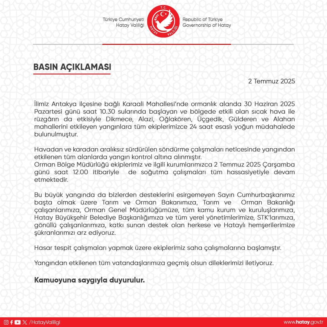 Hatay Valiliği Antakya’da 6 mahalleyi etkisi altına alan yangının söndürüldüğünü ve soğutma çalışmalarının devam ettiğini belirtti. Hatay Valiliginin konuya ilişkin açıklaması şöyle: “İlimiz Ant...