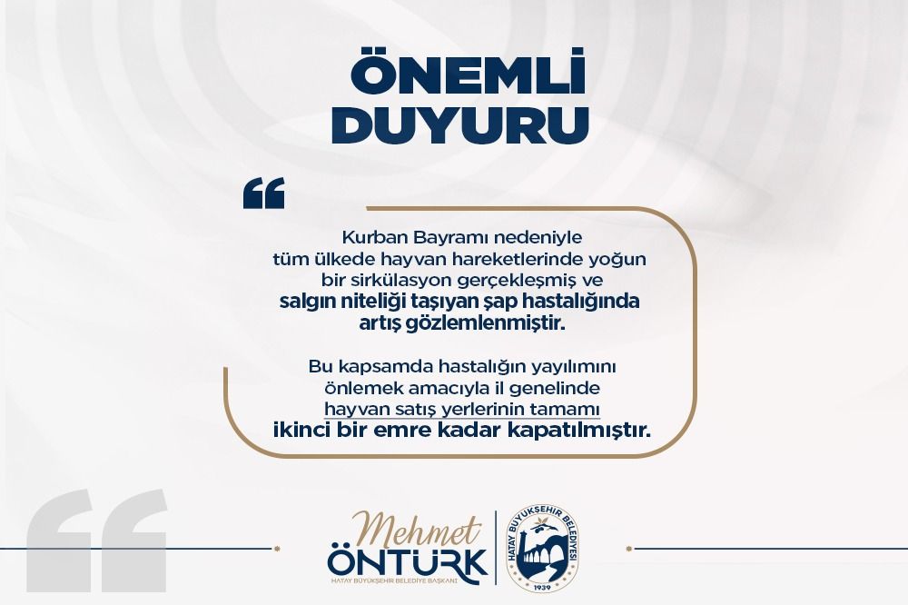 Hatay Büyükşehir Belediyesi , Tarım ve Orman Bakanlığının aldığı karar doğrultusunda tüm illerde olduğu gibi Hatay’da da hayvan pazarları, canlı hayvan borsası, hayvan toplama ve satış merkezlerinin g...