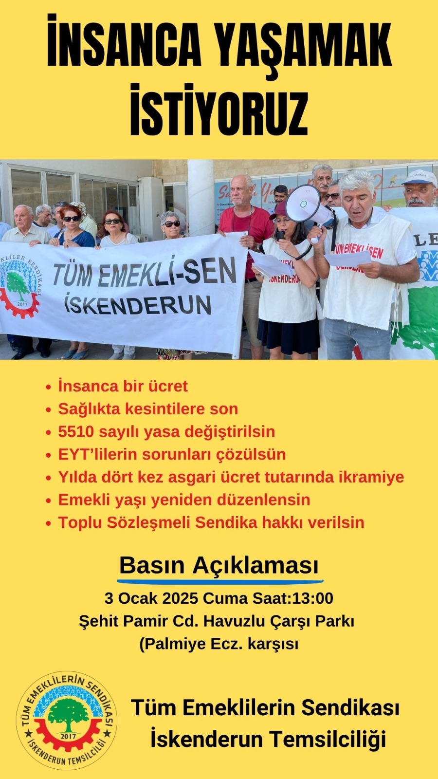 Tüm Emeklilerin Sendikası-2017 İskenderun Temsilciliği tarafından 2 Ocak ile 3 Ocak 2025 tarihlerinde İskenderun’da imza kampanyası ve basın açıklaması yapılacak. Tüm Emekliler sendikasından yap...