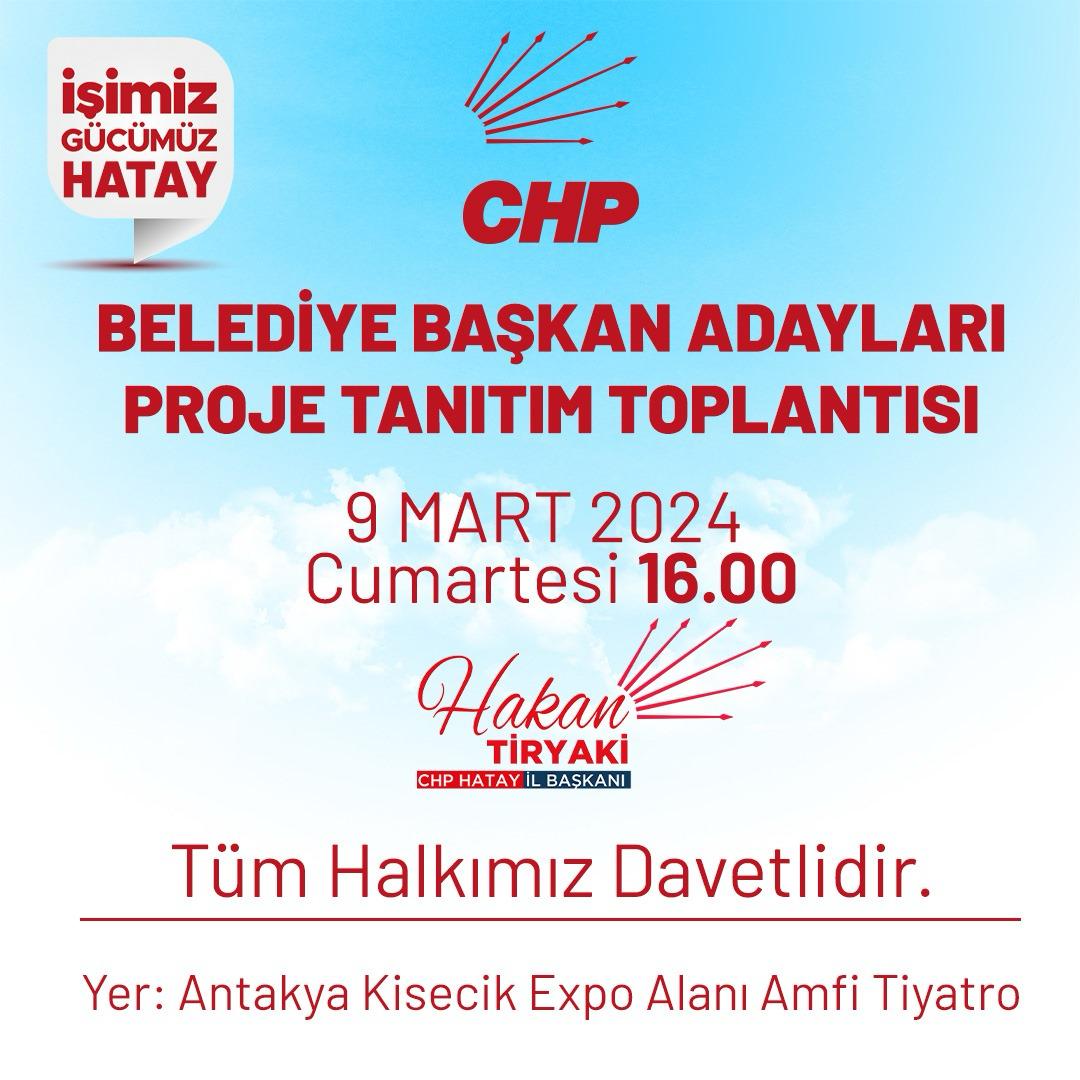 Cumhuriyet Halk Partisi Hatay İl Başkanı Hakan Tiryaki, 9 Mart Cumartesi günü Hatay’daki CHP Belediye Başkan adaşlarının projelerini tanıtacaklarını belirtti. CHP Hatay İl Başkanı Hakan Tiryaki proje ...