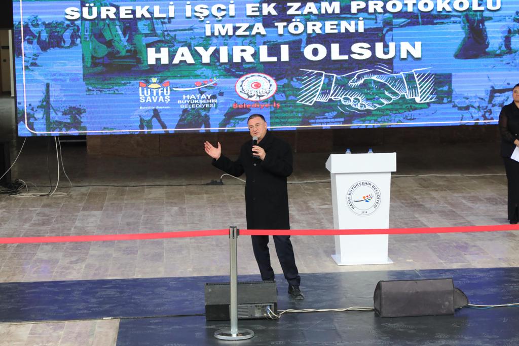 Hatay Büyükşehir Belediyesi’nde çalışan personel için ‘Sürekli İşçi Ek Zam Protokolü’ imza töreni gerçekleşti. Hatay Büyükşehir Belediyesi ve Belediye-İş arasında gerçekleştirilen imza törenine katıla...