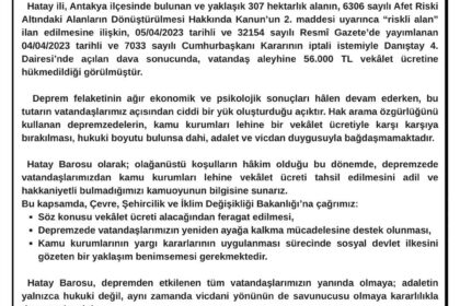 Hatay Barosu, Cumhurbaşkanlığı kararnamesinin riskli alan ilan ettiği bölgelere dava açarak kaybeden Depremzedelere yönelik tahakkuk eden 56 bin liralık vekalet ücretinden vazgeçmesi çağrısında bulund...