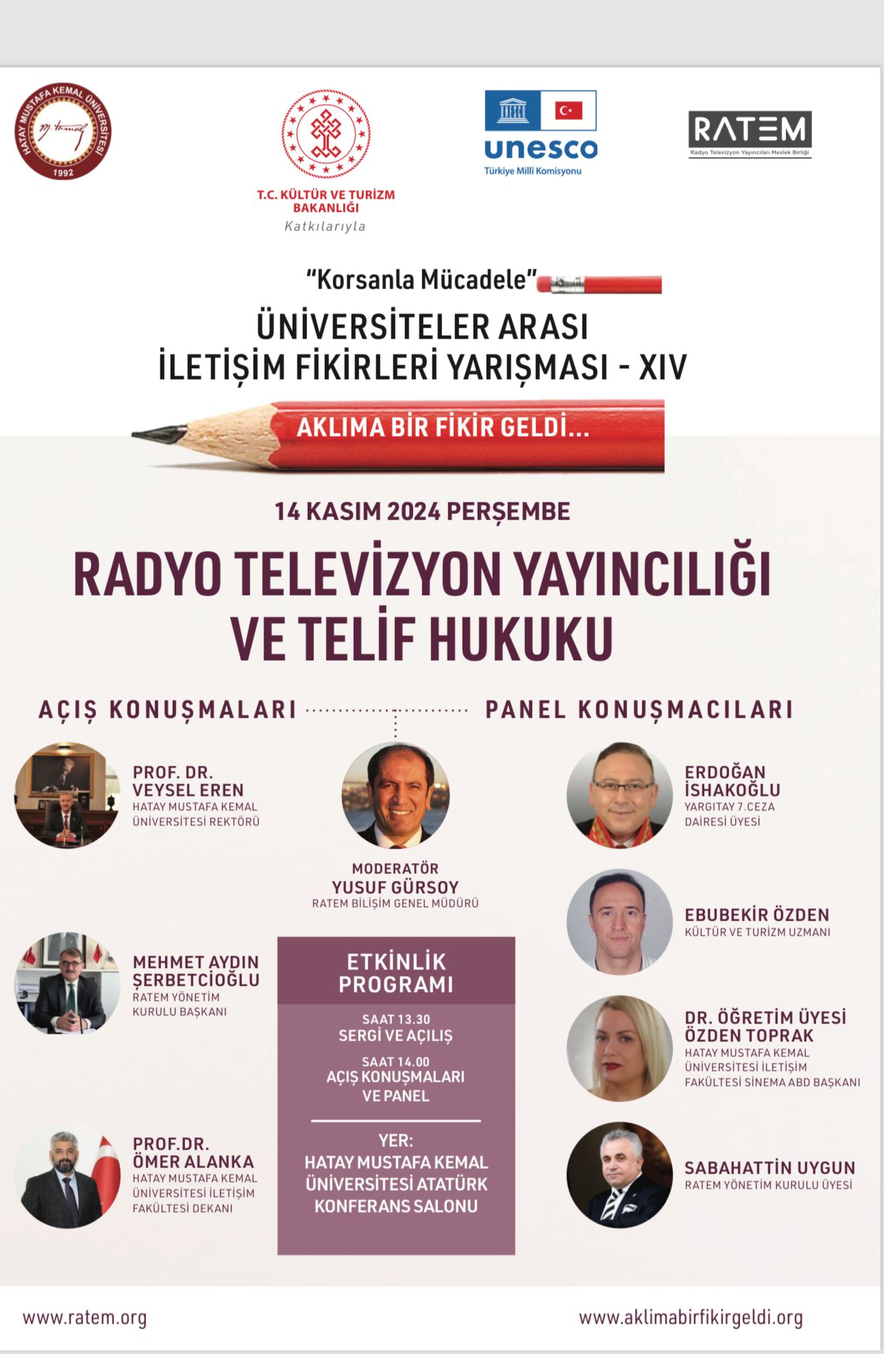 Üniversiteler arası iletişim fikirleri yarışmalarından “Radyo Televizyon yayıncılığı ve telif hukuku” paneli RATEM Bilişim Genel Müdürü Yusuf Gürsoy moderatörlüğünde 14 Kasım Perşembe günü (Yarın) saat 14.00’te Mustafa Kemal Üniversitesi Atatürk konferans salonunda yapılacak.