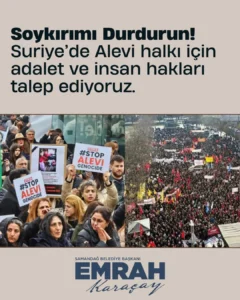 Başkan Emrah Karaçay, “Suriye’deki Alevi Halkı için Adalet ve İnsan Hakları talep ediyoruz” ifadesinde bulunarak tepkisini şöyle dile getirdi: