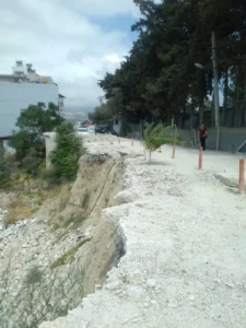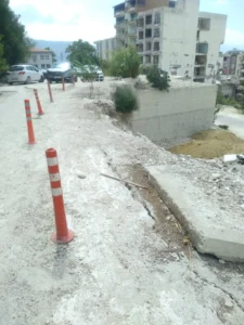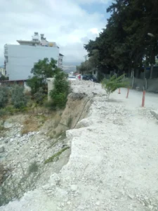 “Burası Samandağ Atatürk Ortaokulu’nun öğrenci geçiş yolu. İki yıldır bu halde ve tüm yetkililerin bilgisi var. Yolun yarısı göçmüş durumda, alt tarafı 20 metrelik uçurum. Yolun diğer yarısı ise çatlamış, ilk yağmurda çökecek. Birkaç duba koyarak önlem alınmış sayılmaz!