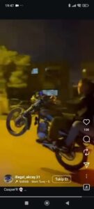 24/03/2024 tarihinde sosyal medyada yayınlanan İskenderun İlçesi Bekbele Mahallesinde 31… plakalı motosiklet ve sürücüsü trafiği tehlikeye düşürecek şekilde motosikletinin ön kaldırma, akrobasi hareketler yapma ve saygısızca araç kullanma görüntülerinin sosyal medyada yayınlaması ve bu görüntülerin tarafımızca tespit edilmesi üzerine yapılan çalışmada bahse konu motosikletin sürücüsünün E.Ş. tespit edilmiştir. Şahsa 2918 sayılı Karayolları Trafik Kanununun Madde 66 (Akrobatik Hareketler Yapmak), 36/3A (Sürücü belgesiz araç kullanmak), 32/1 (Dikiz aynası eksik veya olmadan araç kullanmak) ve 78-1/B (Koruma başlığı olmadan motorsiklet kullanmak) maddelerinden gerekli cezai işlem uygulanarak sürücüye toplam 15.863TL cezai işlem uygulanmış, sürücü TCK Madde 179 kapsamında (Trafik Güvenliğini Tehlikeye Düşürmek) suçlarından gerekli adli işlem yapılmıştır.