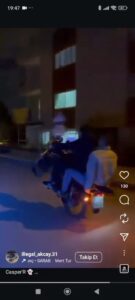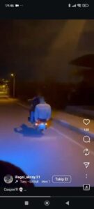 24/03/2024 tarihinde sosyal medyada yayınlanan İskenderun İlçesi Bekbele Mahallesi içerisinde 31… plakalı motosiklet ve sürücüsü trafiği tehlikeye düşürecek şekilde motosikletinin ön kaldırma, akrobasi hareketler yapma ve saygısızca araç kullanma görüntülerinin sosyal medyada yayınlaması ve bu görüntülerin tespit edilmesi üzerine yapılan çalışmada bahse konu motosikletin sürücüsünün M.T. olduğu tespit edilmiştir. Şahsa 2918 sayılı Karayolları Trafik Kanununun Madde 66 (Akrobatik Hareketler Yapmak), 32/1 (Dikiz aynası eksik veya olmadan araç kullanmak) ve 78-1/B (Koruma başlığı olmadan motorsiklet kullanmak) maddelerinden gerekli cezai işlem uygulanarak sürücüye toplam 2886TL cezai işlem uygulanmış, sürücü TCK Madde 179 kapsamında (Trafik Güvenliğini Tehlikeye Düşürmek) adli işlem yapılmıştır.