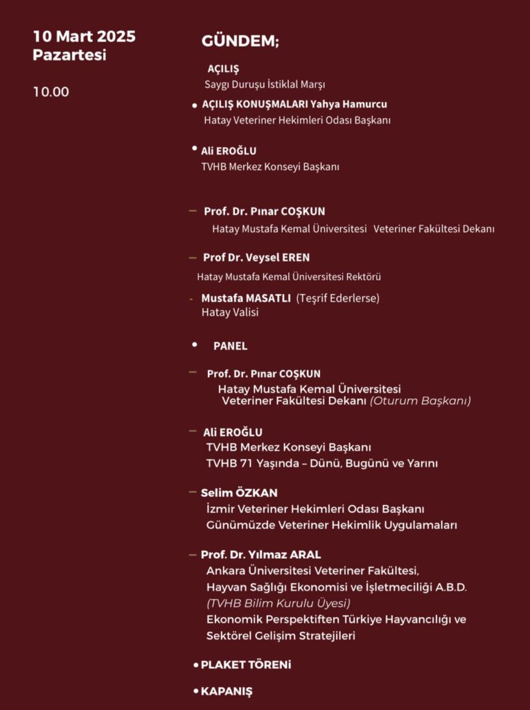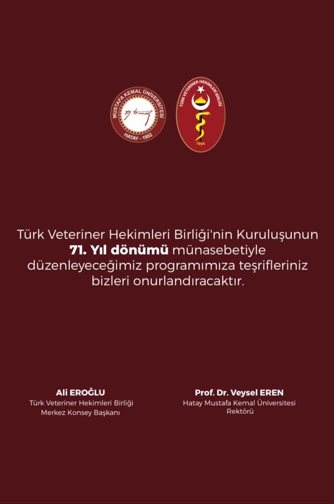 Hatay Veteriner Hekimler Odası ,Türk Veteriner Hekimler Birliği ve Mustafa Kemal Üniversitesi Rektörlüğü’nün 71. Yılını birlikte kutlayacaklarını belirtti.