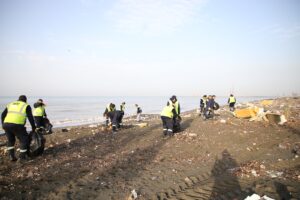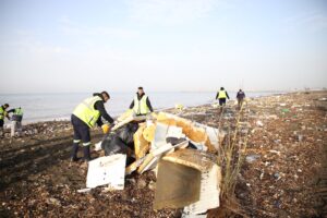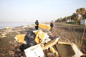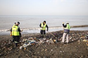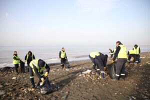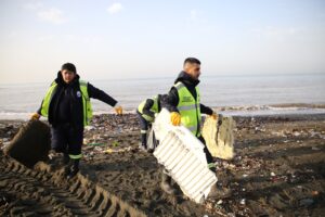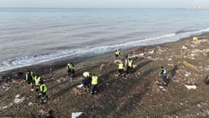 Sağanak yağmurun etkisiyle Dörtyol Dörttaş Sahiline derelerden deşarj olan ve biriken katı atıkları temizleyen Hatay Büyükşehir Belediyesi ekipleri. 2 km’lik kıyı şeridinde çevre kirliliğinin önüne geçmek adına yaptığı çalışmalarda 30 ton civarında katı atığın temizlenmesini sağladı.