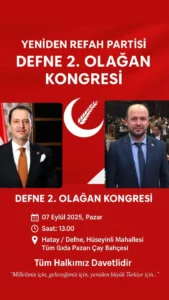Yeniden Refah Partisi’nin Hatay Defne 2. Olağan kongresinin 7 Eylül Pazar günü(Yarın) yapılacağı bildirildi.